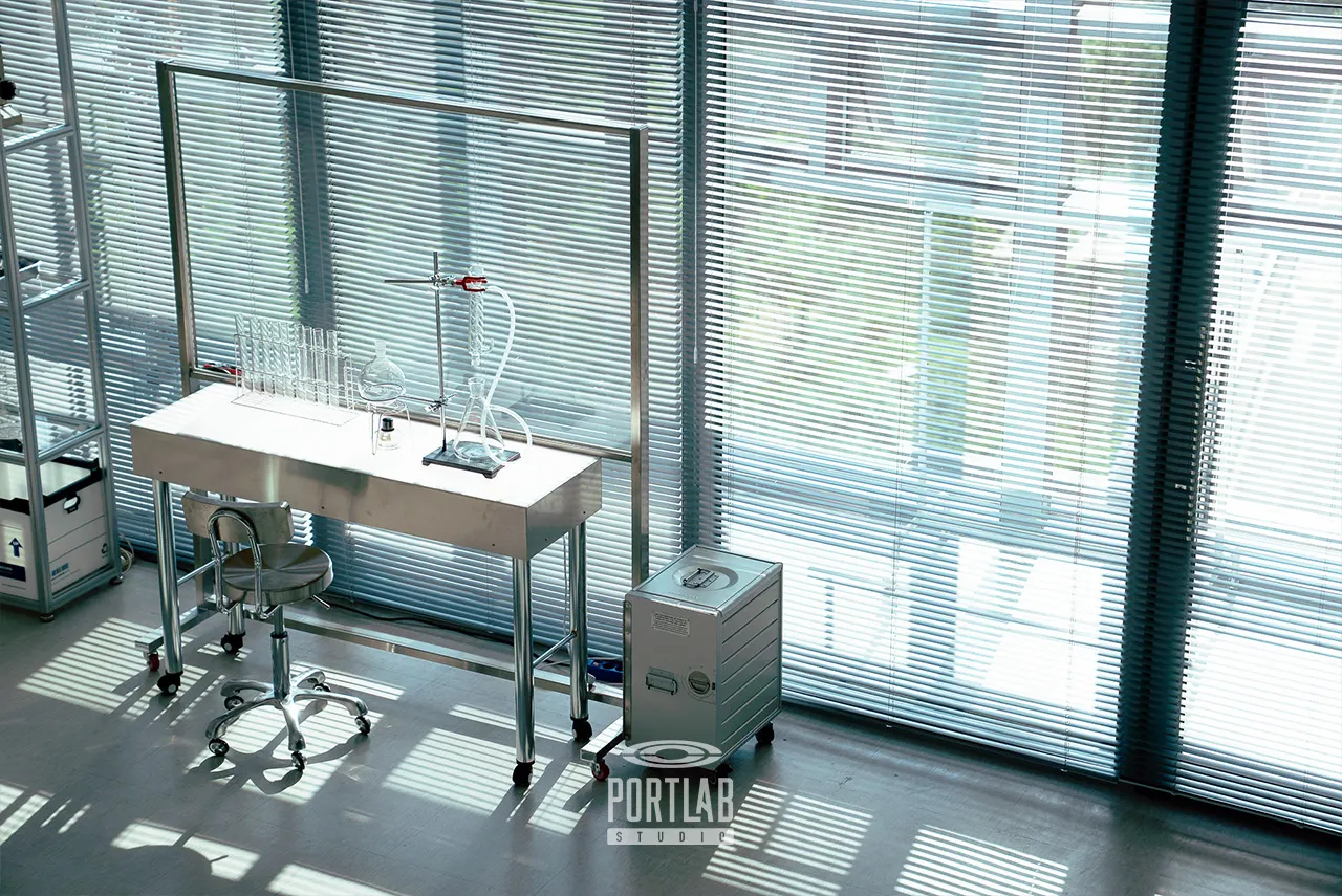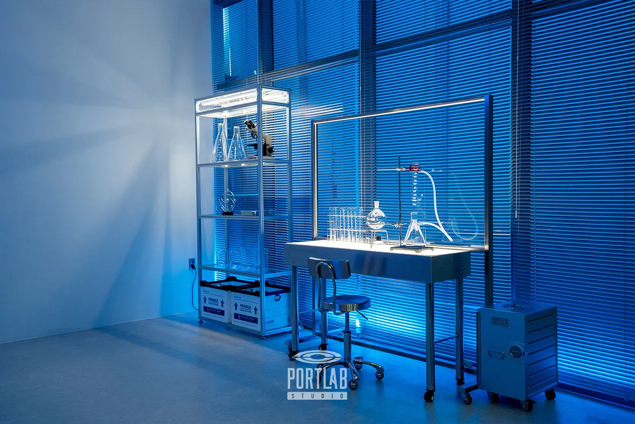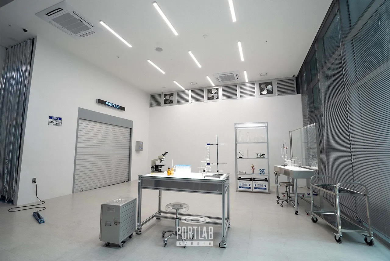 컨셉[A]는 다양한 스틸 재질의 가구와 실험 소품들이 배치되어 있습니다.