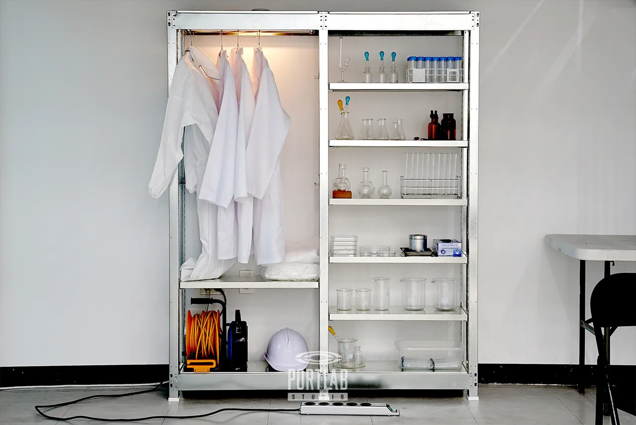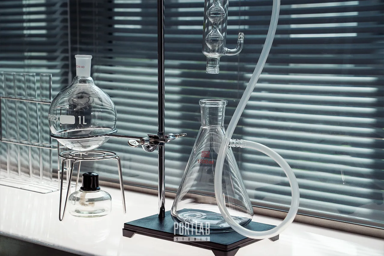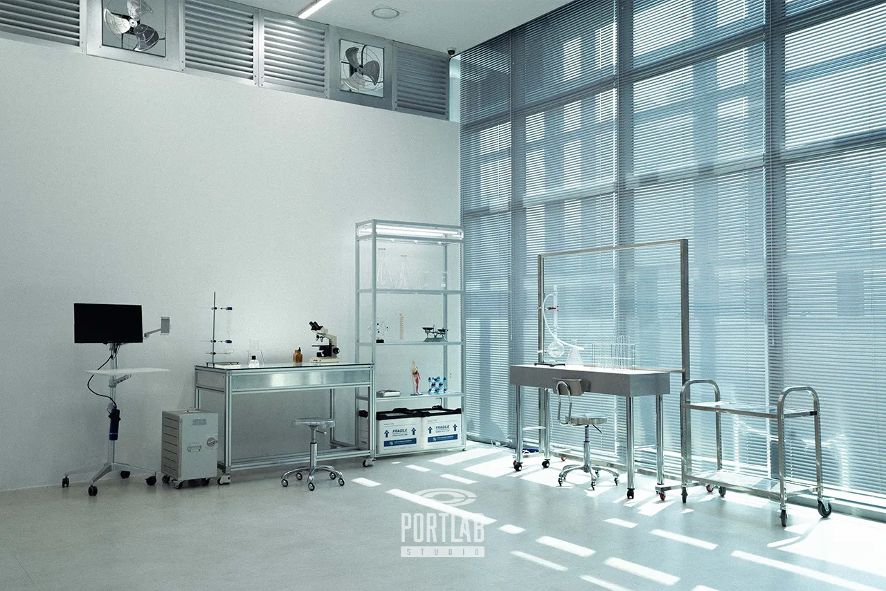 컨셉[A]는 다양한 스틸 재질의 가구와 실험 소품들이 배치되어 있습니다.